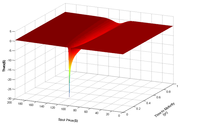 2. θ (theta) 期權價格受「時間」影響的程度,也就是每過一秒,權利金改變多少。