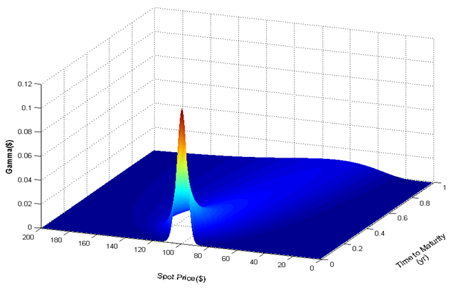 5. γ (gamma) Delta對資產的微分,或是期權對資產的二階微分。Delta上漲1%,期權變動多少。