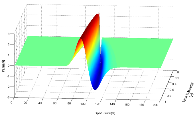 6. Vanna. Delta對隱含波動率的微分,或是Vega對資產的微分,或是期權對資產和隱含波動率的偏微分。