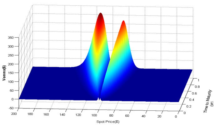 8. Vomma. Vega對隱含波動率的微分,或是期權對隱含波動率的二階微分。