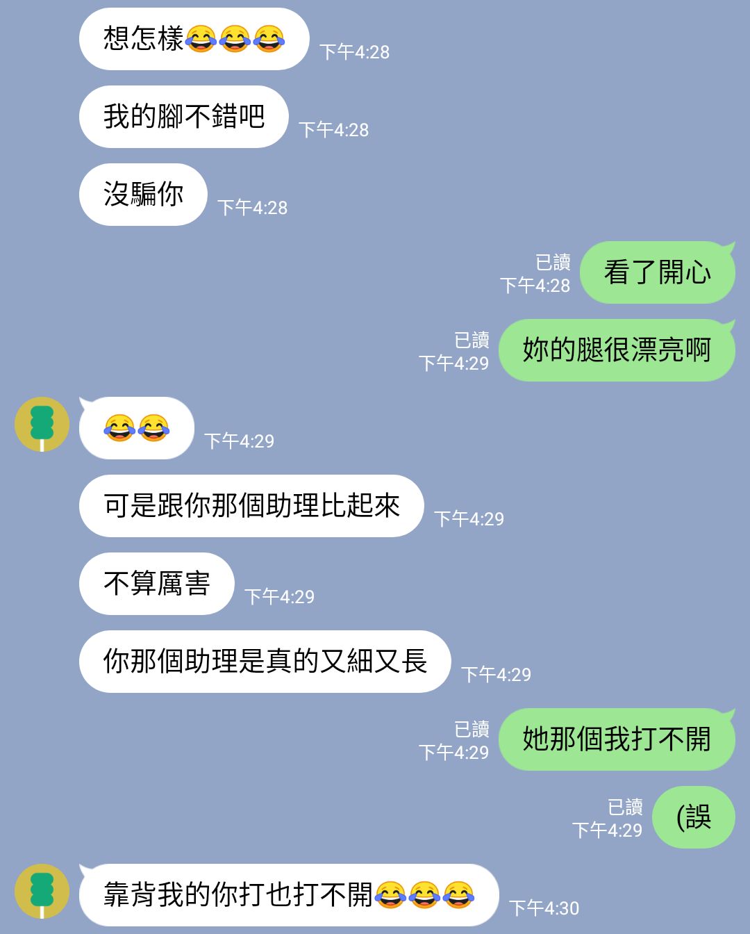 帶著一些不悅,聊到女生身材的時候,我讓她看騙徒計畫「邪教」成員給我的黑絲,結果S似乎受到刺激,叫我原地等著,然後傳來她的腿照。