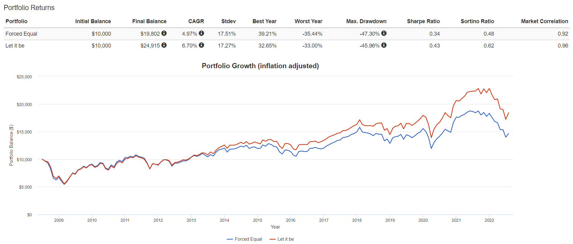 我們可以看到,從2009至今,手動國家均分的策略,報酬更差、波動風險更高、最大下跌更慘、Sharpe和Sortino等風險調整後收益更低,從頭輸到尾。