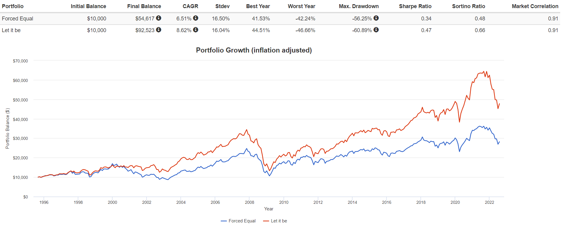 回過頭看強迫國家均分的策略,在最終報酬、年化報酬、波動風險、最佳年度、最差年度、最大下跌、Sharpe和Sortino,都沒有贏的時候。