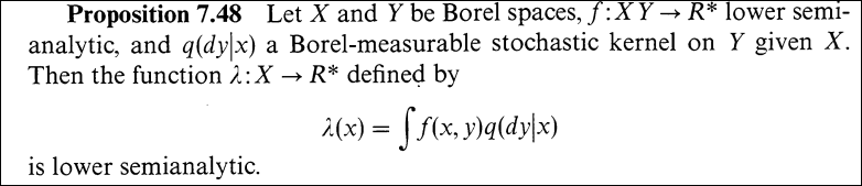 所以為了保證最壞情況下的值函數可測,也為了繼續跑線性規劃,妳可以使用Souslin的analytic sets(1917年證明Borel可測集的投影可能不是Borel可測集,20出頭年紀推翻數學家勒貝格1905年的說法,而老師Luzin等人利用超限和二進位的具體推導過程在1923年),以及upper semianalytic函數(Bertsekas & Shreve, 用負lower可推導對偶,在取sup和Borel kernel積分下封閉,且自動泛可測)。