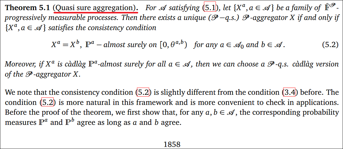 而要把模型融合成quasi-sure的通用版本,本質就是aggregation(聚合)問題,有些人會用格論(lattice STZ 2011)和medial limit來統一各版本,以及用Jankov–von Neumann可測選擇等方法選擇核或耦合。