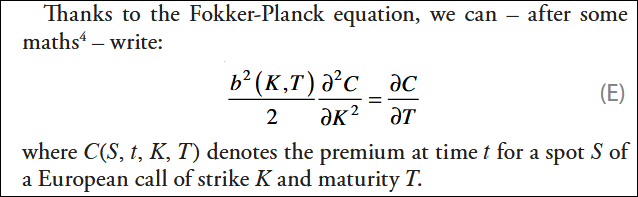 Dupire經典(1994),但有很多傳統假設需要滿足,像是連續、夠平滑、夠正則(C¹’²類可微)、靜態無套利,這樣反推的局部變異數才可能會非負有限。