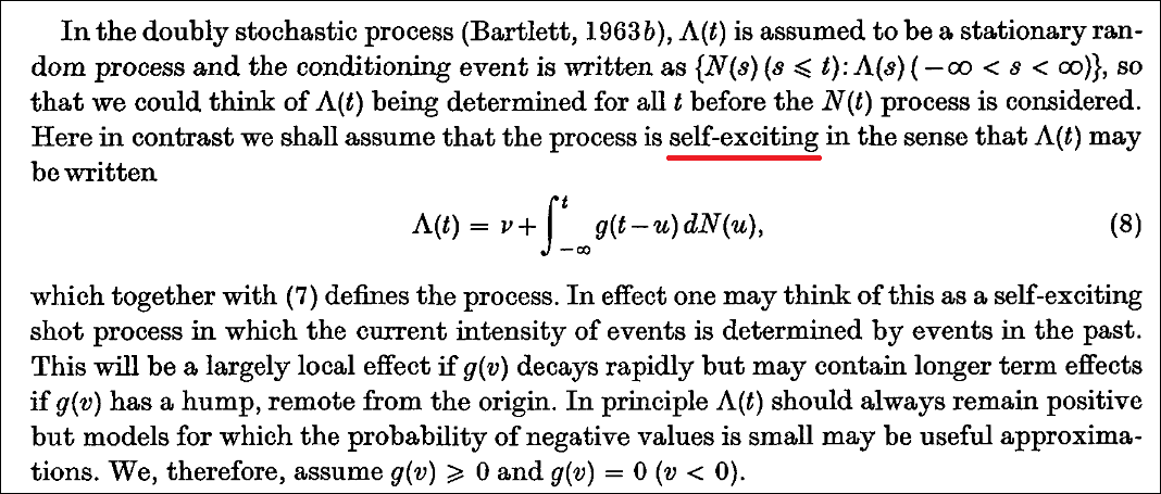 [27] HAWKES, ALAN G. (1971). Spectra of some self-exciting and mutually exciting point processes. Biometrika, 58(1), 83-90. https://doi.org/10.1093/biomet/58.1.83