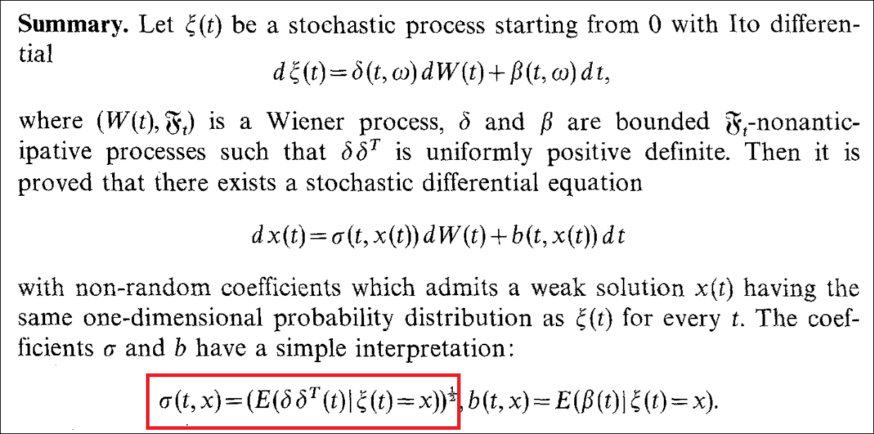 [2] Gyöngy, I. (1986). Mimicking the one-dimensional marginal distributions of processes having an ito differential. Probability Theory and Related Fields, 71(4), 501-516. https://doi.org/10.1007/bf00699039