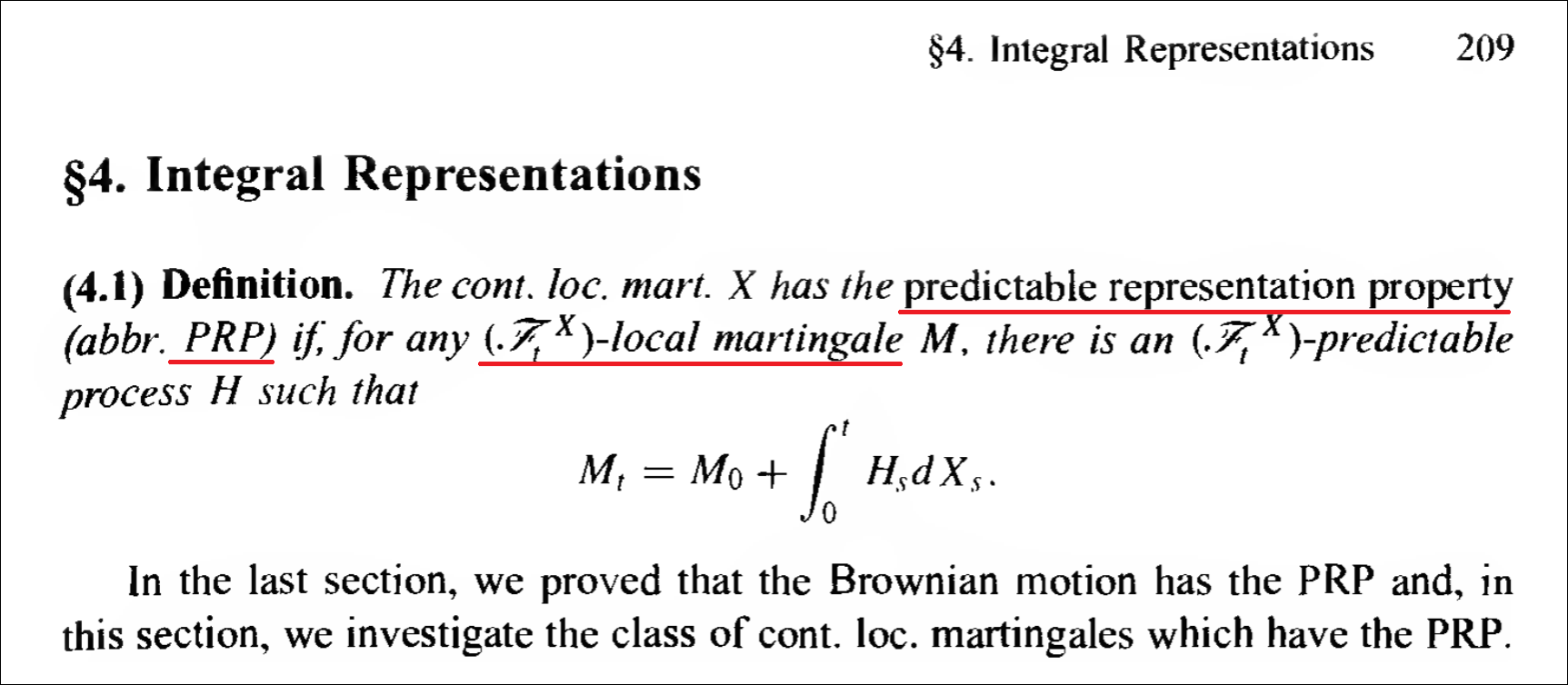 資訊結構,如果filtration有PRP(predictable representation property),則每個F-local鞅都可寫成某組基本鞅的隨機積分。