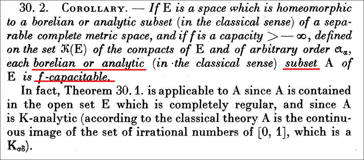 [6] Choquet, Gustave (1954). Theory of capacities. Annales de l'Institut Fourier, 5, 131-295. https://doi.org/10.5802/aif.53
